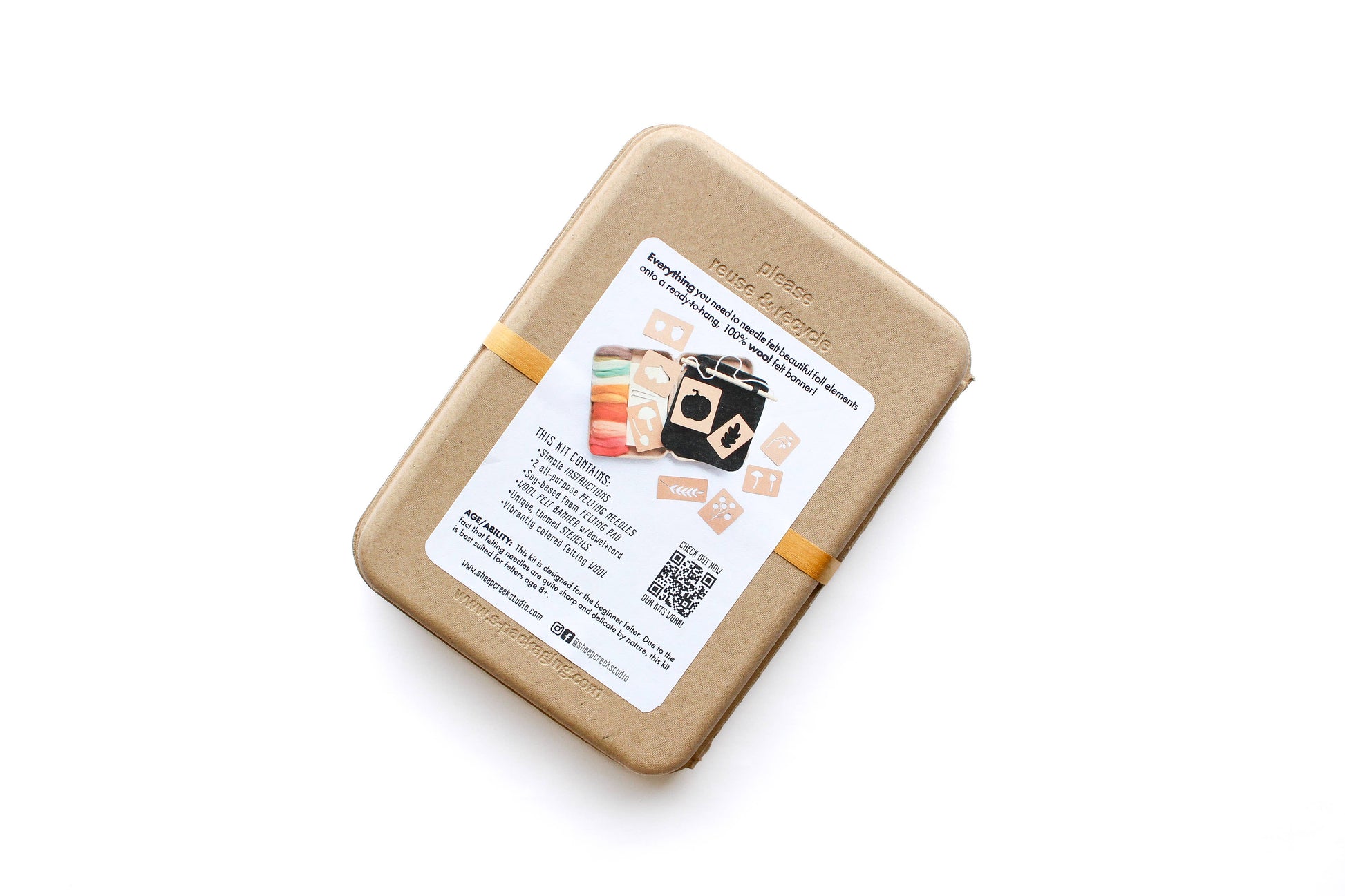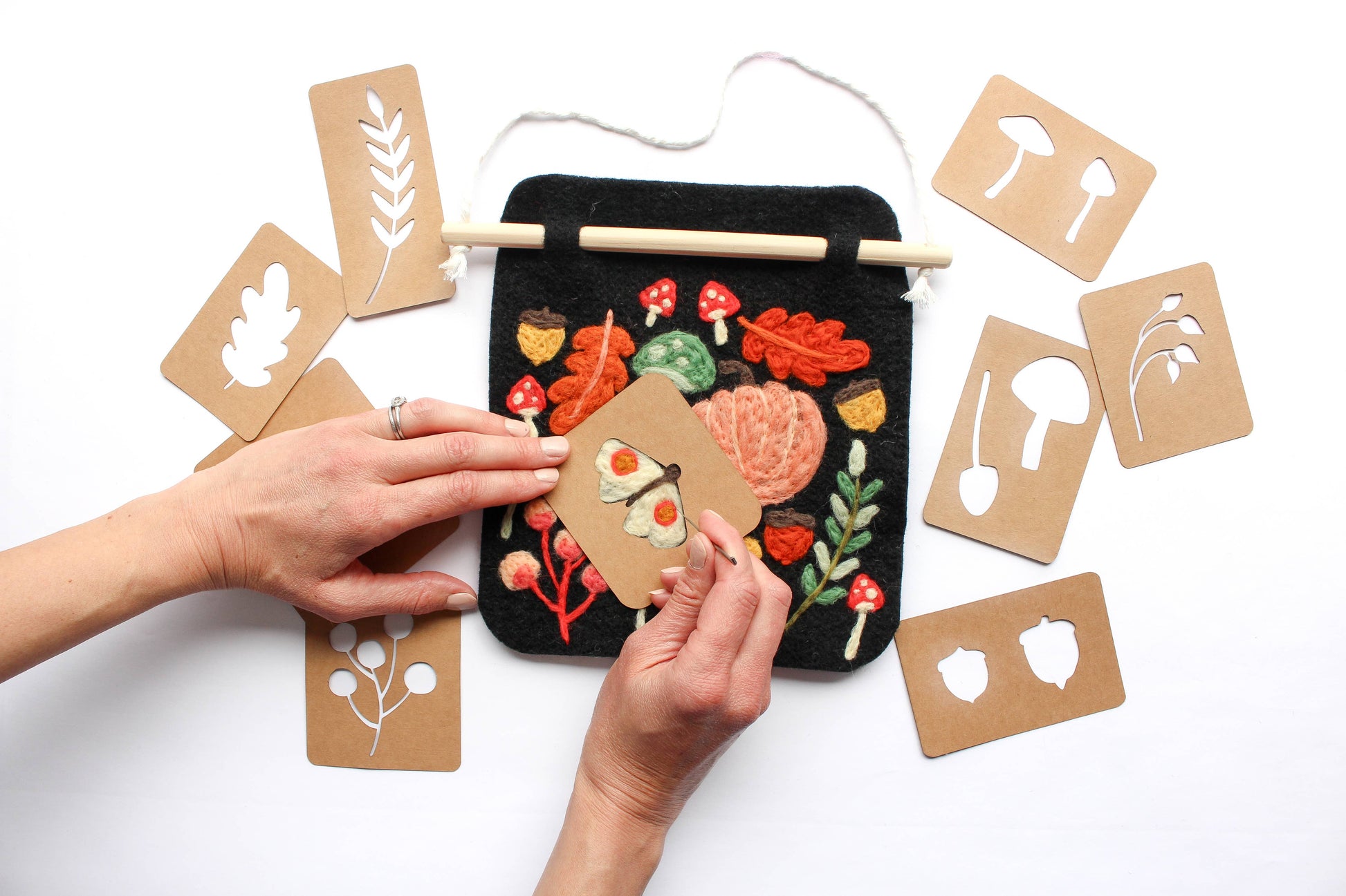 Bring the beauty of fall to life with this beginner-friendly Needle Felting Kit! Using sturdy cardstock stencils and simple instructions, you’ll needle felt autumn leaves and woodland elements onto an 8"x8" ready-to-hang 100% wool banner. A lovely gift as a kit or finished piece.