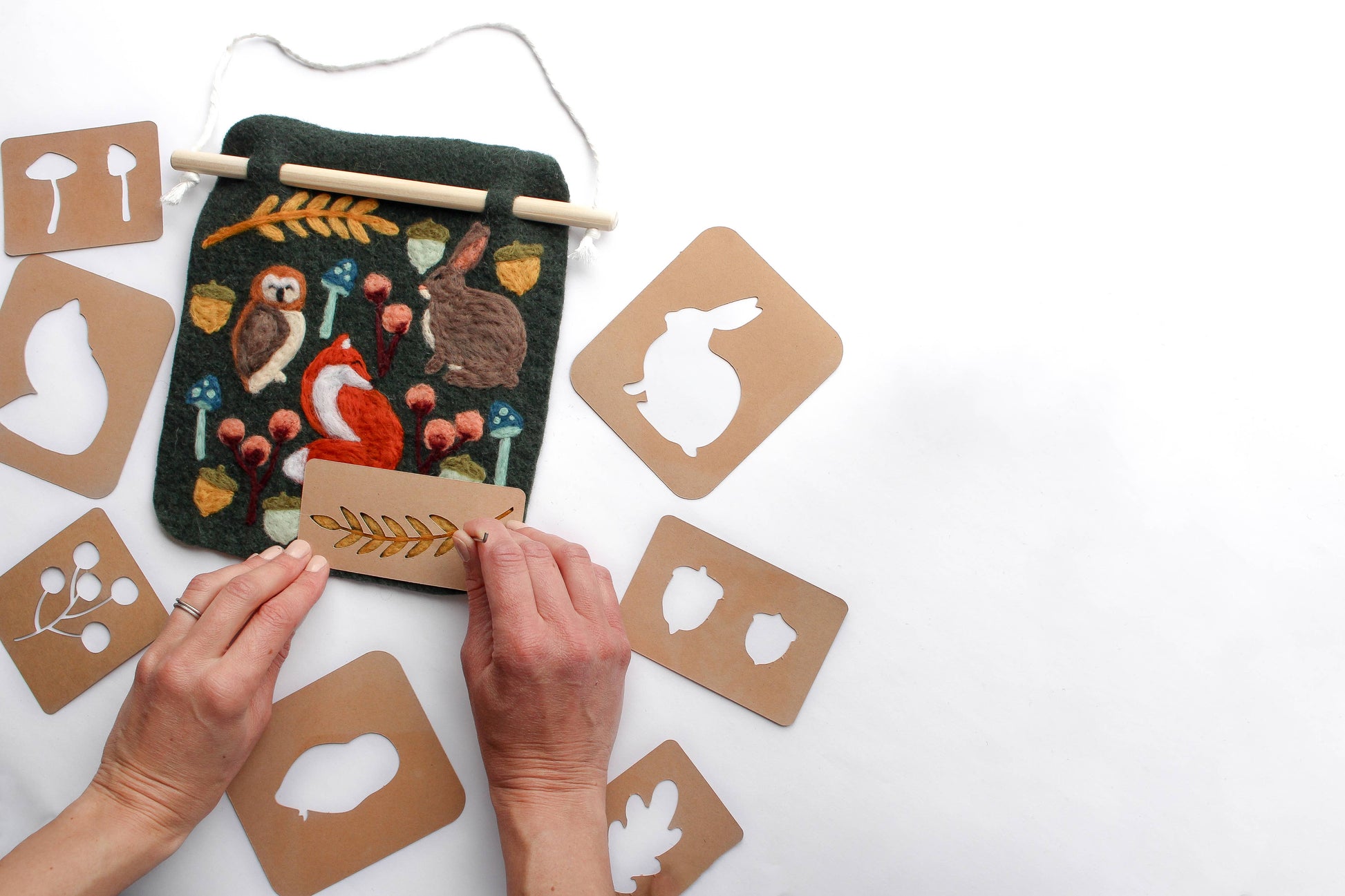Create charming woodland scenes with this beginner-friendly Needle Felting Kit! Using sturdy cardstock stencils and simple instructions, you’ll needle felt adorable animals and foliage onto an 8"x8" ready-to-hang 100% wool banner. A delightful gift as a kit or finished piece—perfect for baby showers, birthdays, friends, and more.