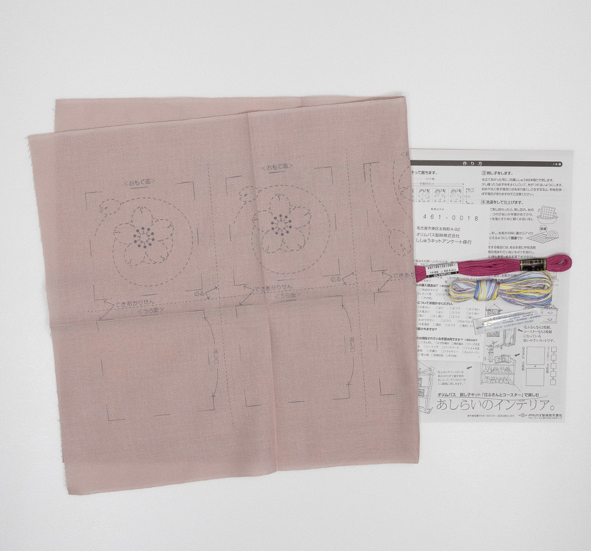 Make five beautiful coasters featuring a cherry blossom design on soft pink fabric, with cute little tassels in the corners! A simple, useful sashiko project for beginner to intermediate stitchers.