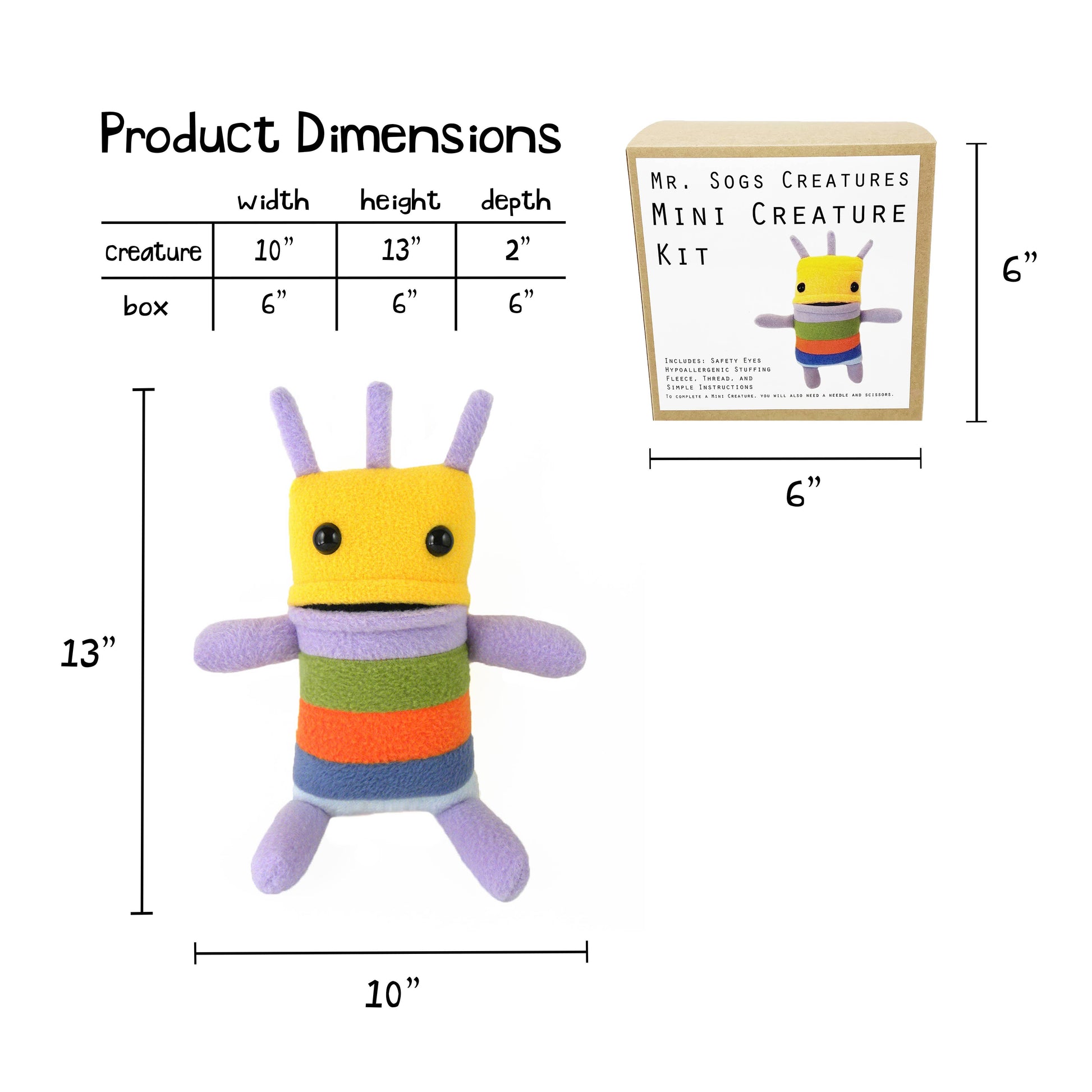 Each kit contains pre-cut fabric, thread, needle, safety eyes, fiber-fill stuffing, illustrated instructions and pattern. To complete your creature, you will need a pair of scissors. A completed creature will measure approximately 13" tall. Sewing machine optional. Recommended for ages 8 years and older.
