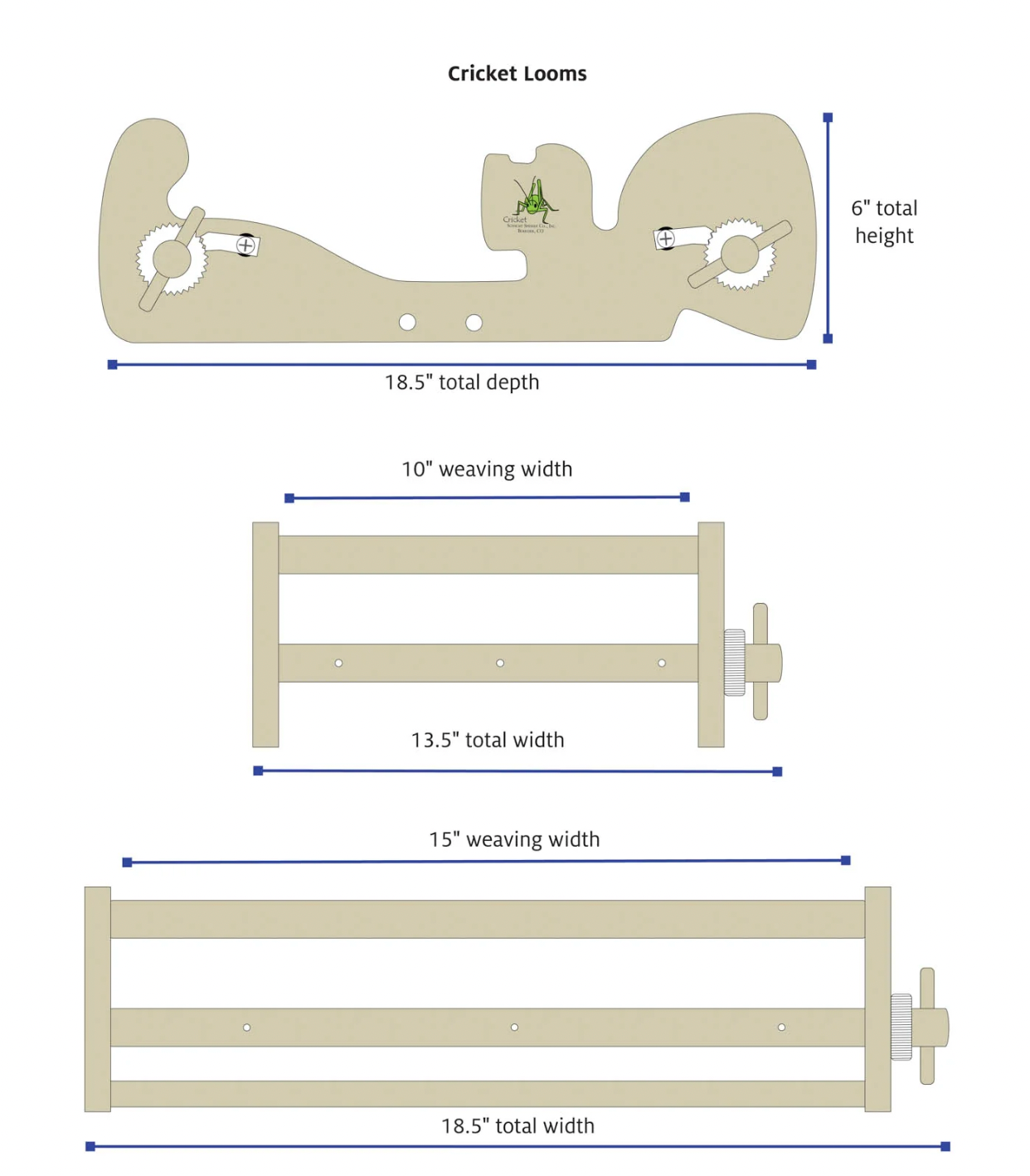 The Cricket is made of high-quality maple plywood and hard maple and is left unfinished. Each Cricket comes with an 8-dent reed (sorry, no substitutions, but other sizes are available here). You'll receive a threading hook, warping peg, table clamps, two shuttles, and two balls of yarn (yarn colors will vary).