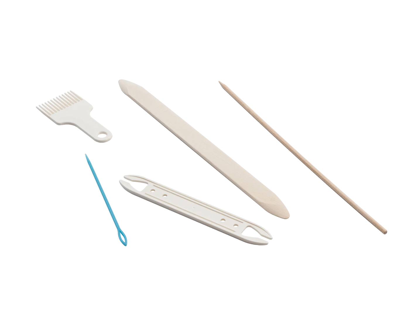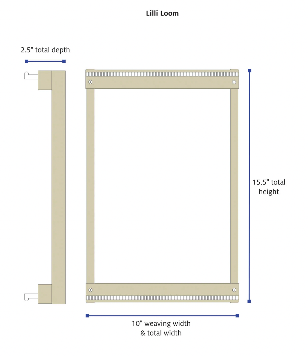 The Lilli Loom is made of solid hardwood maple with sturdy no-slip plastic teeth. You can wind the warp for either 6 or 12 ends per inch. The 10" x 15" is an ideal size for learning to weave, making samples, small projects, and travel.